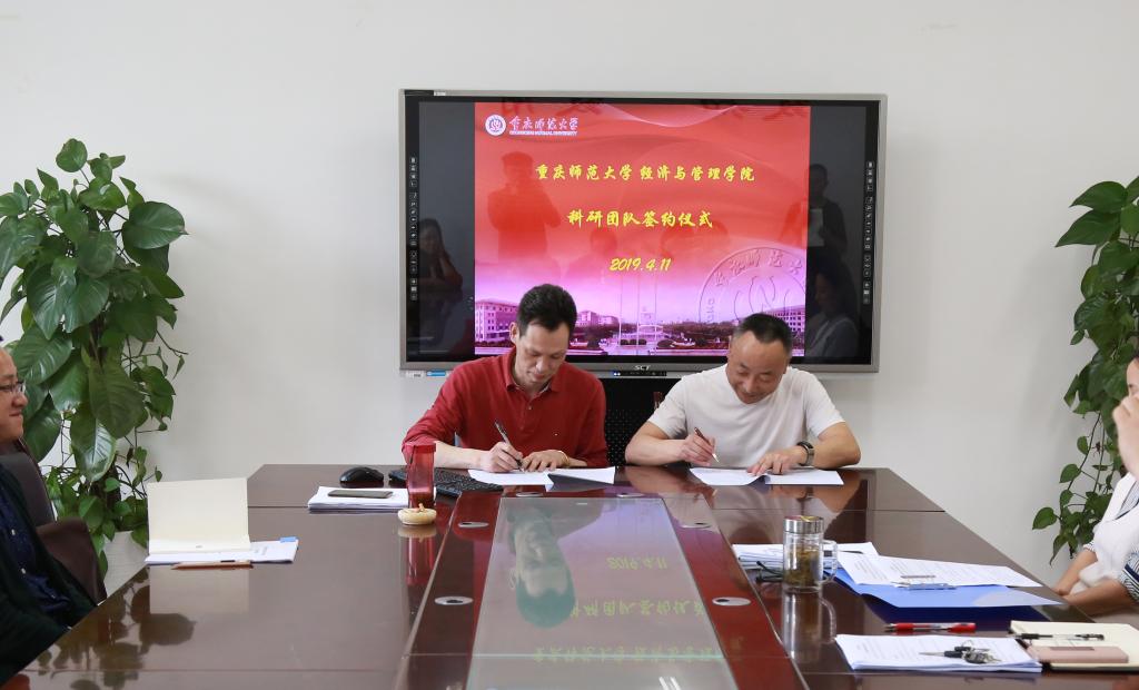 在学院会议室举行了院内科研创新团队建设签约仪式。分别与以重庆市应用经济学学术技术带头人胡兵教授为负责人的“青年博士科研创新团队”、重庆市管理科学与工程学术技术带头人后备人选邹艳教授为负责人的“能源经济科研创新团队”签订了为期三年的团队建设任务书。