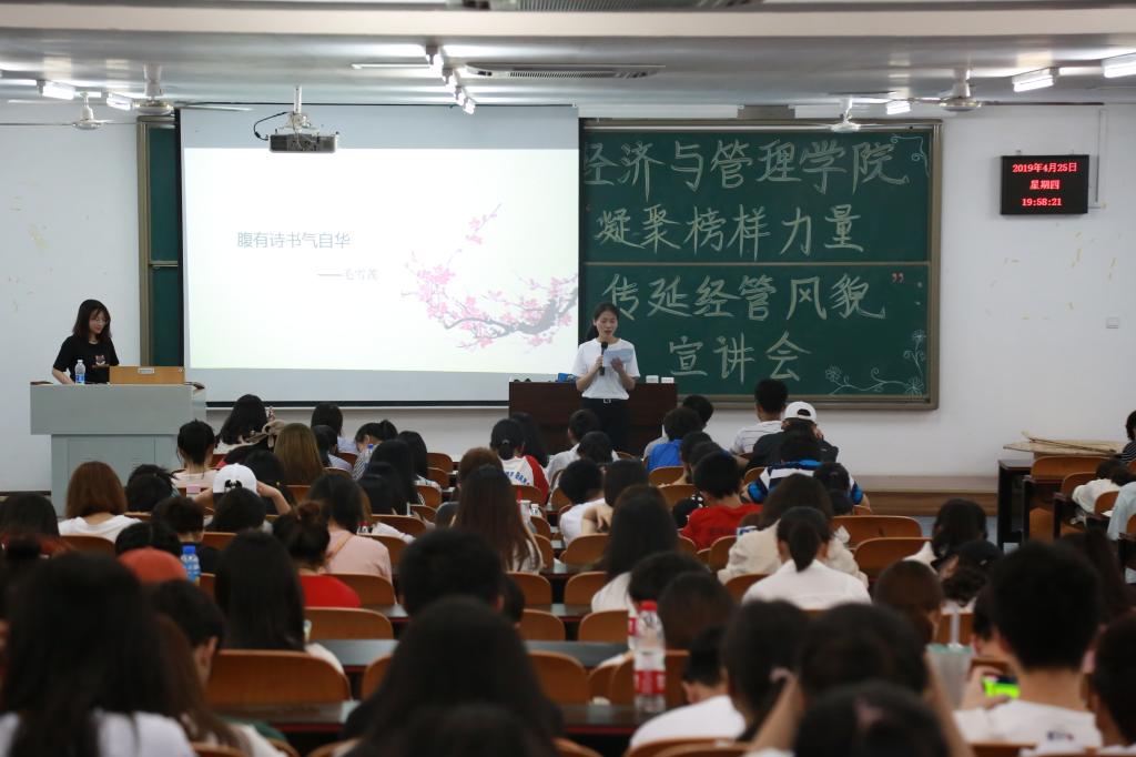 本次宣讲从3月29日开始,持续一月,实现了学生的全覆盖宣讲,重点开展了三项工作。一是积极培育、深入挖掘先进典型。学院结合实际,选树学院三好学生、优秀学生党员和优秀学生干部、文明大学生、先进班集体和文明寝室等方面的先进典型,组建学院“凝聚榜样力量,传承经管风貌”宣讲团。二是广泛组织、持续开展示范引领工作。学院积极组织“凝聚榜样力量,传延经管风貌”宣讲团进支部、进课堂、进社团、进宿舍,通过专题宣讲、分组讨论、面对面互动交流、谈体会谈心得等方式,大力开展先进集体说示范,学生党员说引领,学生干部说担当,三好学生说学习,文明学生说事迹“五说”活动,不断增强吸引力,进一步的在院内形成“向先进学习,向榜样靠拢”,比、学、赶、帮、超的良好氛围。三是以推进学院文化建设为核心,全方位多角度立体引领。宣讲活动的开展以推进学院文化建设为主线,不断深化载体,充分发挥微博、微信等新媒体优势,依托学院官网、“青马微信公众平台”、QQ官方微博,设立“文化之声-表彰先进宣讲会”专目,实现先进典型宣传工作常抓常新。同时,学院把先进典型宣传融入“寝室风采大赛”“职业生涯规划大赛”等第二课堂活动,进一步拓宽宣传载体,实现了宣讲与专业活动相结合,增强了感染力和感召力。