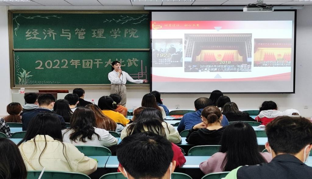 在求是楼321举办以“砥砺奋进守初心,青春献礼二十大”为主题的团干部岗位实践能力大比武比赛。分团委书记张莉,分团委学生会学生副书记牟佳和组织部主要负责人彭瑶担任评委。