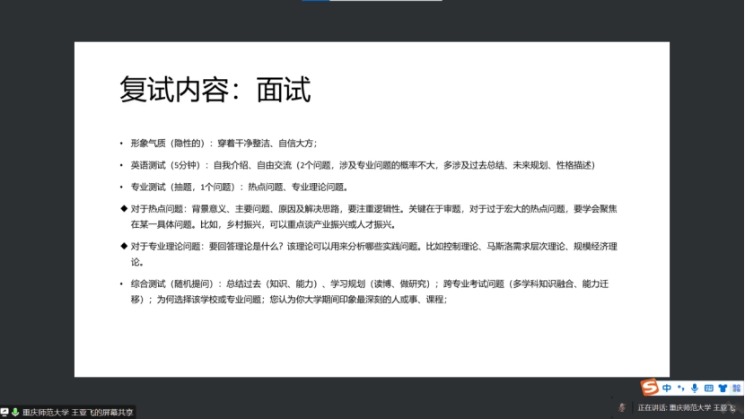 会上,段俊老师首先对今年坚持考研的同学给予了充分肯定,提醒同学们要做好查询报道文件、针对对英语口语交流环节充分练习、提前做好时间规划等试前准备,避免面试环节出现因粗心造成的差错。其次,王亚飞老师就言谈举止、问题回答准备、经济热点讨论的切入点等面试过程中的细节问题进行举例详细说明,鼓励同学们稳住心态,保持自信。