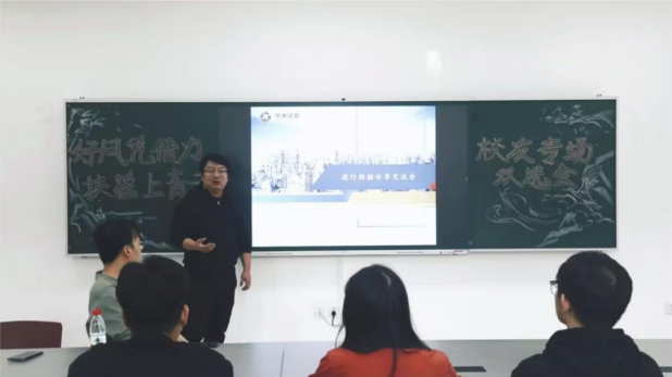 为打造“学校+校友”就业共同体,下午四点,以“好风凭借力,扶摇上青云”为主题的校友专场双选会活动在求是楼133顺利举行。双选会上,国联、华英证券公司业务总经理、优秀校友戴雨皓结合自身经历,从校园和职场两个方面分享工作经验和心得,详细介绍了其公司的基本信息、性吧以及发展前景,鼓励学弟学妹们要把握好在校时光,提升综合素质,增加自己未来职业生涯“砝码”。与此同时,国联证券重庆营业部总经理孟书勇勉励大家从多角度提升自己,强化优势,并表示将积极为性吧