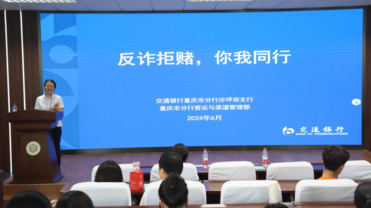 于2024年6月20日下午三点半在求是楼517教室举办了一场专题反电信诈骗知识讲座。此次讲座特邀交通银行重庆市分行沙坪坝支行副行长蔡依莉、叶在清,以及渠道与营运部风险管理部负责人邓婧担任主讲嘉宾,2022级100余名学生代表参与。