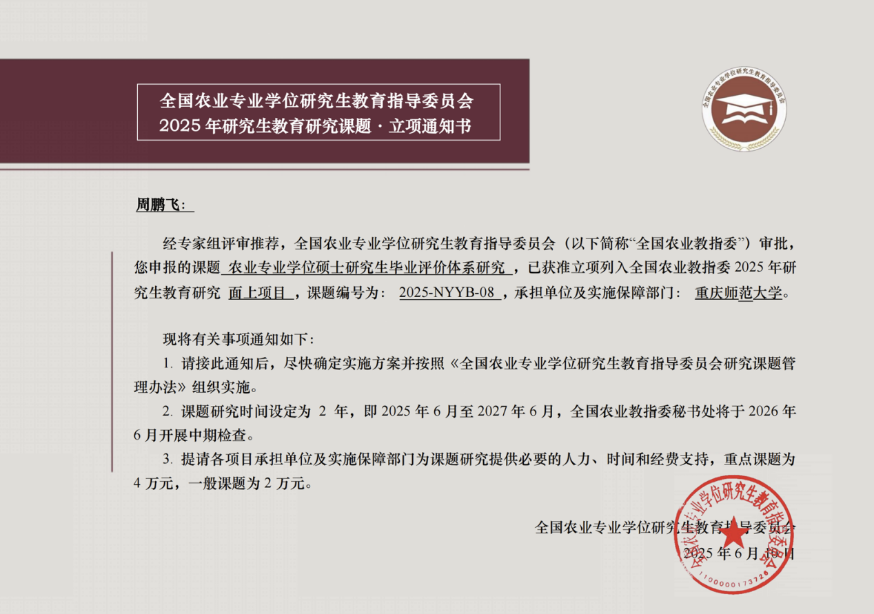 周鹏飞教授申报的《农业专业学位硕士研究生毕业评价体系研究》课题成功获批为面上项目(课题编号:2025-NYYB-08),充分体现了性吧