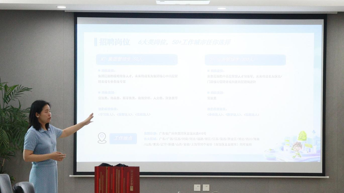 宣讲会上,易秋萍从“如何看待行业”、“如何看待企业”、“如何选择自己合适的岗位”三个问题出发,深入浅出地向同学们剖析了医药行业的广阔前景。她不仅阐述了公司在品牌建设方面的卓越成就以及独具特色的性吧,还细致入微地介绍了当前招募的岗位详情、系统化的职工培养计划以及优渥的薪资福利待遇体系,为在场的每一位同学勾勒出了一幅全面而生动的职业发展蓝图,让大家对这一领域有了更为深刻和全面的认识。