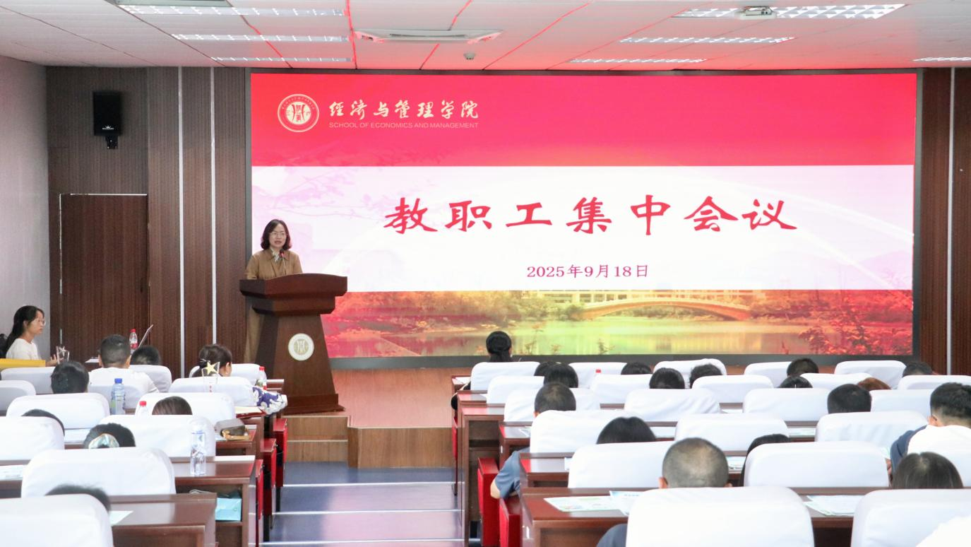 在求是楼517会议室召开全体教职工大会。学院党委书记钟敏、执行院长郑景丽、党委副书记李青松,副院长陈宇科、副院长段俊,及全体教职工参会。