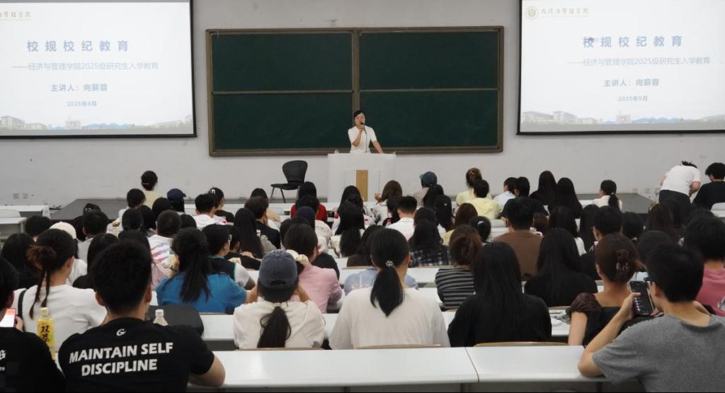 在图北楼17101教室举办研究生新生入学教育大会。学院副院长陈宇科,教学秘书吴云,研究生辅导员向薪蓉、王雪薇,以及学院2025级研究生新生参加。