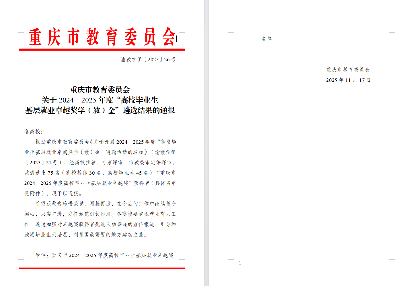 近日,重庆市教育委员会公布了2024-2025年度“高校毕业生基层就业卓越奖学(教)金”评选结果,性吧