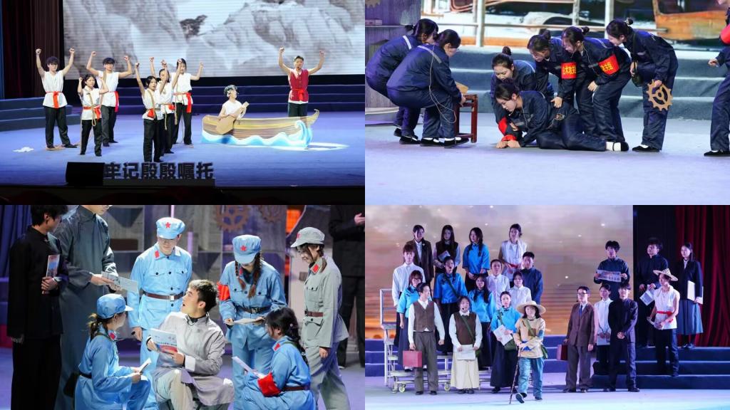 第一篇章《回望·精神的传承》通过《觉醒·奋楫》《实业报国》《回望·追光》三个情景剧目,巧妙融合光影艺术、叙事手法与朗诵表演,生动再现了青年觉醒时的担当意识、实业报国的经世情怀以及革命精神的永恒光辉。