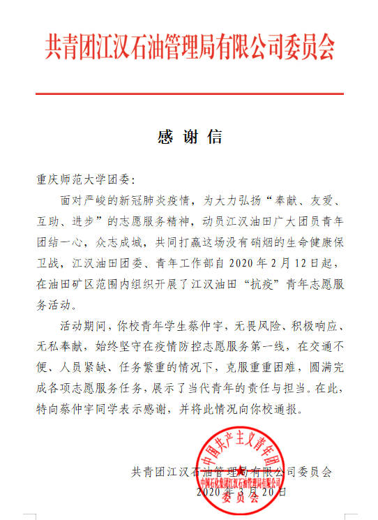 他在江汉油田向新小区协助当地社区做好蔬菜搬运,仔细认真的向每一户人家分配新鲜的蔬菜,在自己的不懈努力之下最终也收到了当地居民的感谢和赞扬。正如他所说的:“狂风骤起,劲草迎击;烈火凶燃,真心砥砺。灾难面前没有无辜者,希望能为这次抗疫工作尽自己的一份力量,初生牛犊不怕虎,越是艰险越向前!”