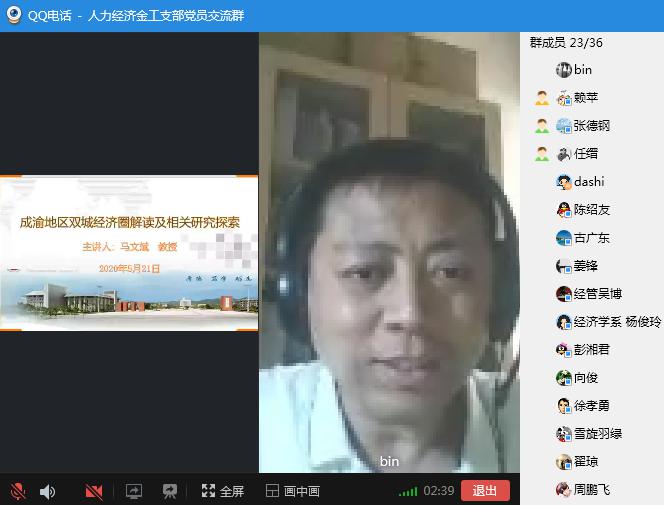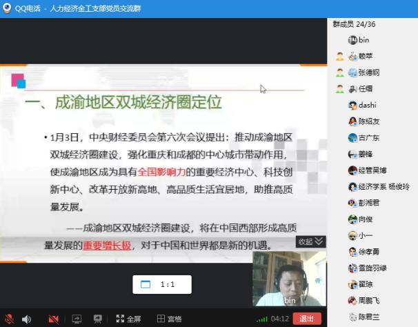 为响应国家推动建设“成渝地区双城经济圈”的重大决策部署,更好地发挥高校在“成渝地区双城经济圈”建设中的智库作用,积极服务经济社会发展,5月21日下午2:30-4:30,金融工程、经济学和人力资源管理三个教工支部通过QQ直播联合召开了一场以推动建设“成渝地区双城经济圈”为主题的线上组织生活。