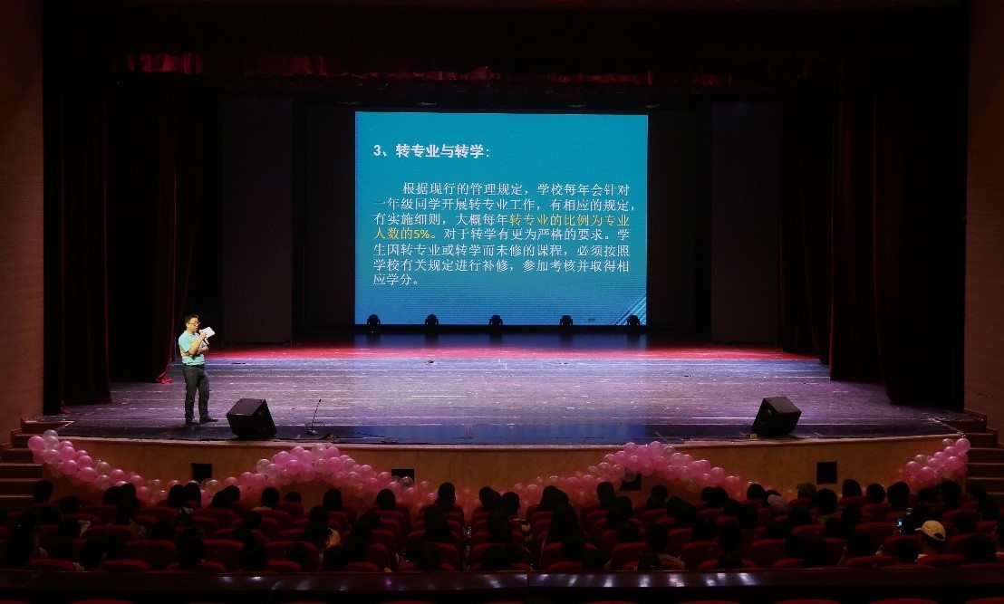 2018年秋,性吧 又注入了新鲜血液,迎来400多名新生。为解答新生对大学的学习方面的疑惑,促进新生对学院的了解,同时加强学籍制度管理,认真把关教学质量,性吧 于913日下午四点半在校友会堂演出厅开展了针对2018级新生的“入学教育之学习与学籍管理教育讲座”,并由性吧 黄浩老师任主讲人。在辅导员胡雪梅老师和柴风梅的组织下,全体新生到场学习聆听。