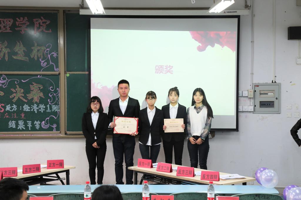 首先双方立论,精确阐述己方观点及支撑理论,然后经过申论、前场小结两个环节后进入最精彩的自由辩论环节,双方辩手龙争虎斗、各出奇招,局势难解难分。随后进入结辩环节,正方认为缩短贫富差距在于每个人都应有平等的机会,重点阐述穷人自身抓住机会为之奋斗而摆脱贫困,反方更加追求结果平等,过程中先富带后富,富人精英掌握大部分财富与资源达到价值创造的最大化,最终以优良的社会环境让穷人走向富足。在双方精妙的结辩之后评委进行点评,指出辩手的优点与不足,辩手也在评委的点评中了解了更多辩论的技巧。双方观点虽有不同,却殊途同归,实现社会主义的终极目标——共同富裕,无论是机会平等还是结果平等都需要当代中国人不断地摸索与奋斗。最终主持人在辩手与观众热切的期待中宣布结果,反方经济学1班以良好的配合与个人发挥获得胜利,而正方一辩刘秋悦以缜密的逻辑与清晰的阐述赢得了“最佳辩手”奖项,观众以激烈的掌声示以祝贺。