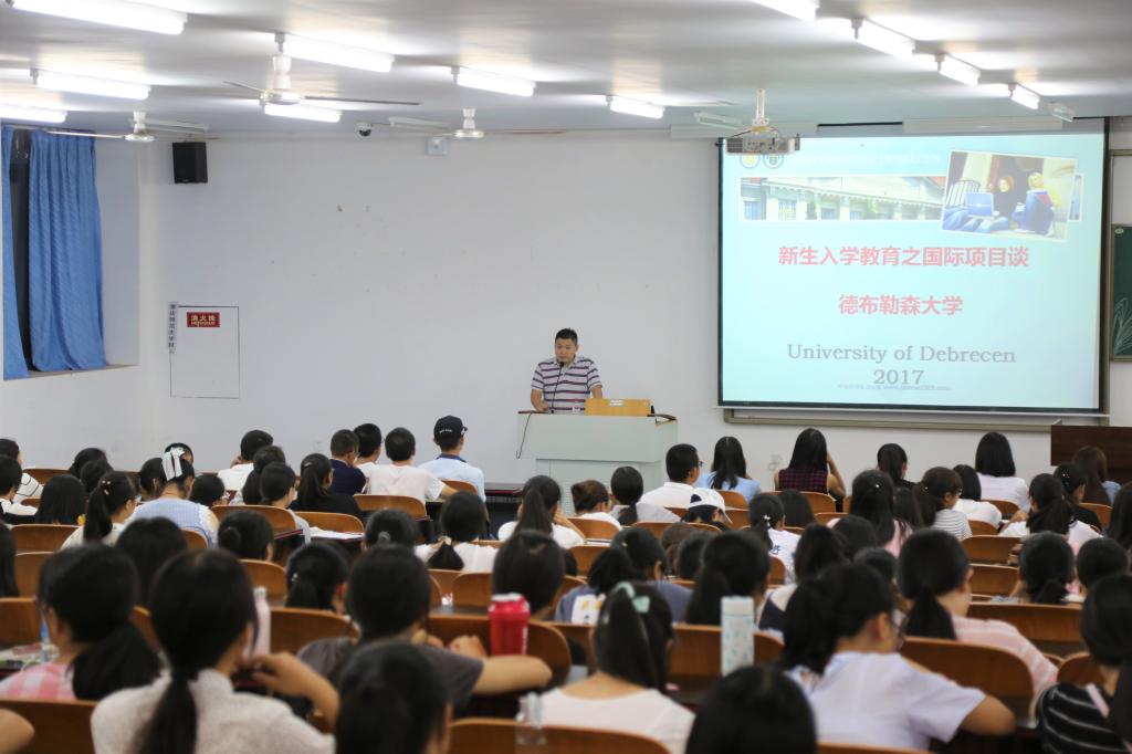 德布勒森大学位于匈牙利第二大城市德布勒森市,是匈牙利历史最为悠久、规模最大的公立大学之一,被誉为世界卫生组织研究中心,欧洲杰出学术贡献研究中心等。该校拥有13个系和2个独立学院,现有在校生三万余人,教职工一千七百余人。在德布勒森大学留学可享受工薪学费、持申根签证、享受世界顶级教育设施以及毕业获全球就业文凭等优势,周教授在就该校项目费用、项目优势、就读程序展开全面的解说后,带领新生们领略德布勒森的基本生活条件与环境,具体包括住宿生活及开支、电脑及网络服务、图书馆、娱乐设施以及运动设备等。