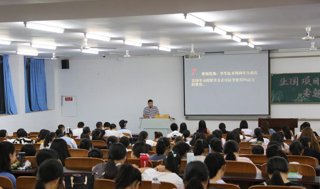 项目合作的鲍尔州立大学与德布勒森大学展开讲解。鲍尔州立大学位于美国印第安纳州中部的曼西市,是美国最著名的公立大学之一,该学校设有7个院系,150多个专业,学校占地面积为1140英亩,在校教职工近千余人,学生两万余人。周教授从该校专业特色、相关费用、就读程序、就读优势等方面进行深入的介绍与讲解,并给同学们展示在校留学生分享回国内的日常生活图片,场面十分亲切。