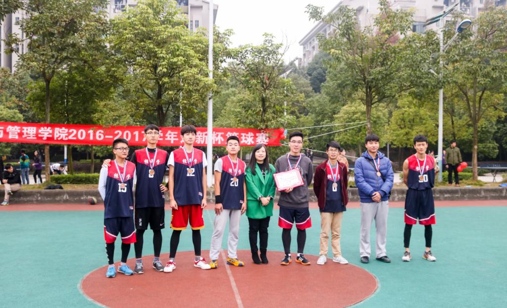 于校篮球场举行“迎新杯”篮球赛总决赛,学院各年级辅导员到场加油助威并担任颁奖嘉宾。