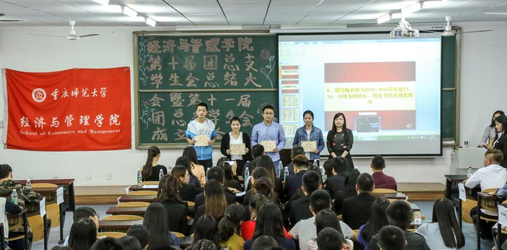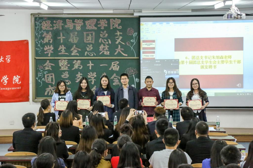 紧接着,第十届团总支学生会干部代表雷学艺对过去一年工作进行了总结并对新一届学生会的发展壮大充满期待。团总支书记朱旭森老师宣读了第十届团总支学生会干部名单并颁发了聘书,对他们的工作给予肯定和支持,接下来辅导员唐爽老师、张莉老师和罗姝老师分别宣读各学年度各班班长与团支书名单以及第十一届团总支学生会主要干部名单,朱旭森书记和唐爽老师分别为其颁发聘书并合影留念。希望他们可以在新的一年里继续做好带头作用,引领着学生会继往开来。第十一届团总支学生会干部代表何欣谊的宣讲,表明会发扬往届的优良传统,携手共创美好明天。