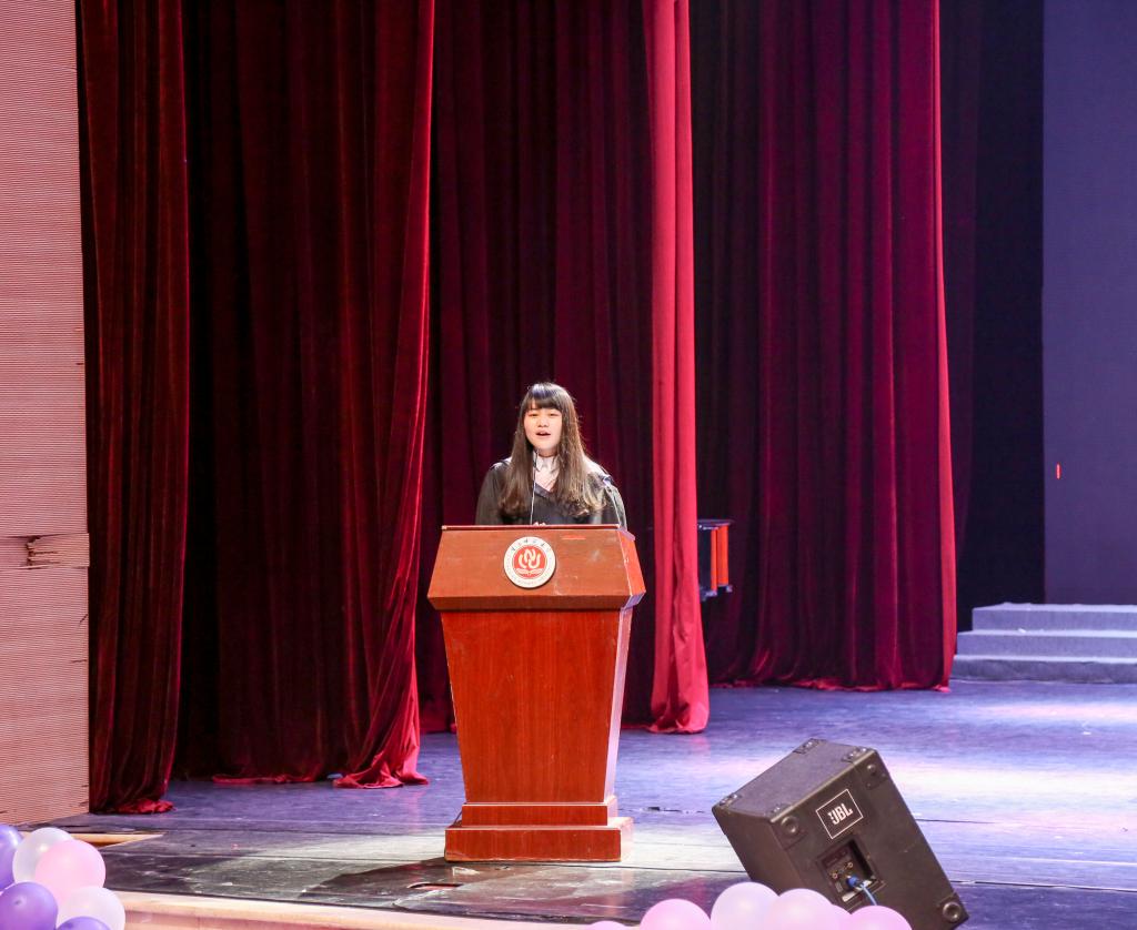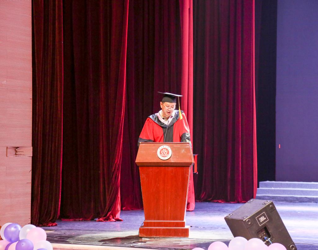 伴随着庄严的国歌,毕业典礼缓缓拉开了帷幕,院长田盈向毕业生们作临别赠言,鼓励毕业生们要对未来坚定希望,要坚守大学精神,开启人生新篇章。在陈道平副院长宣读了2016届优秀优良毕业生以及升学深造的学生名单并为优秀代表颁奖后,优秀毕业生代表康梦楠发言,一首《不说再见》道出她对同学们的依依不舍及对母校的深切怀恋。临近离别,道声祝福,说句珍重。