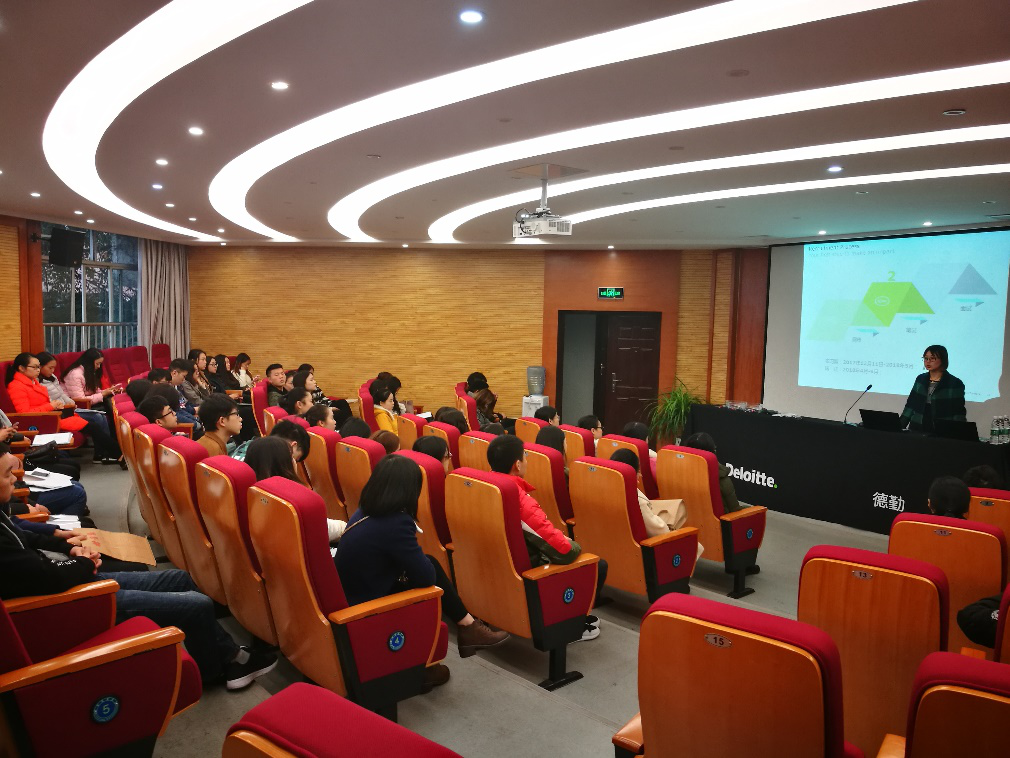德勤全球交付中心校园招聘人力资源部陈女士为毕业生进行宣讲。陈女士就公司背景、公司文化、以及公司发展现状做了详细介绍。并对在场学子进行了简单提问,让学子畅谈毕业后的想法以及如果顺利通过德勤面试进入公司实习希望得到哪些方面的锻炼。