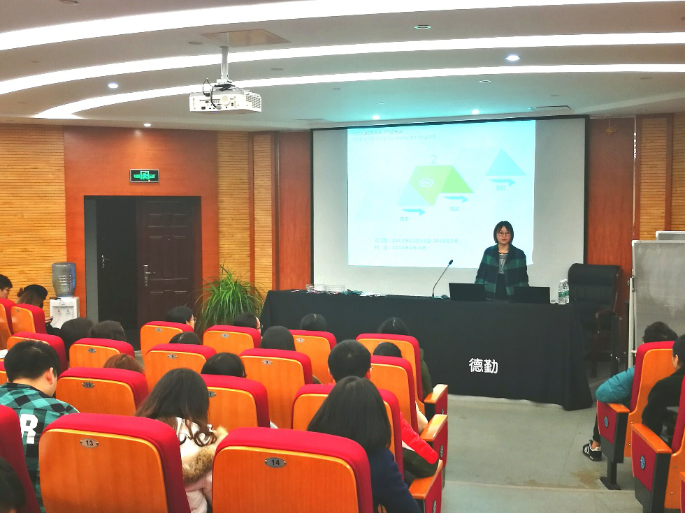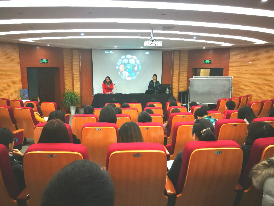 2014级辅导员胡雪梅老师致辞,并对德勤来我校进行宣讲表达感谢。随后,主持人播放德勤百年发展宣传视频。简短的几分发展宣传视频,使同学们对德勤的发展、管理等各方面有了一个简单而又全面的了解。