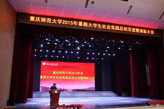 2015年的暑假,有这样一群人,他们依托于各个不同的团队,以中国人民抗日战争暨世界反法西斯战争胜利70周年为契机,积极响应中国梦的主题,实现“为祖国勤学修德、以实践明辨笃实”的目标深入社区、乡镇、农村,广泛开展了主题教育系列活动,将重庆师大的旗帜遍插四十余个区县,将重师精神与实践精神完美的结合在了一起。1022日下午,为了表彰他们的实践精神,我校在校友会堂演出厅隆重举行了暑期大学生实践总结交流暨表彰大会。校党委组织部副部长李晓燕老师、学生处副处长唐家祥老师、招生就业处副处长杨云老师、校团委副书记高菁励老师出席了此次典礼。