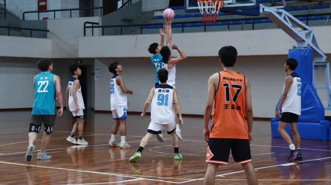 校友之间的篮球友谊赛。在2024年6月10日下午两点半,体育馆二楼篮球馆内,现役校篮球队与17级工商管理校友陈杰巍、张庆源,18级金融工程校友牟俊霖、张太校,19经济学校友李添靓、林恒奇组成的校友篮球队共同上演了一场激动人心的较量。