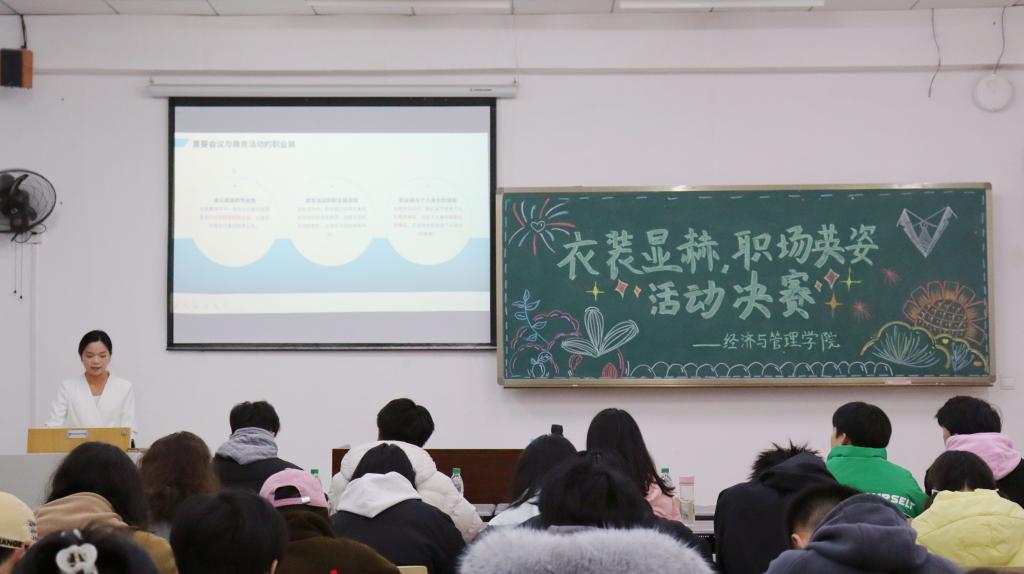“衣装显赫,职场英姿”职场穿搭比赛决赛于砺志楼T2202举行。决赛邀请龚朝珍老师和地理与旅游学院航空服务艺术与管理专业的同学担任评委,7名选手参加决赛。