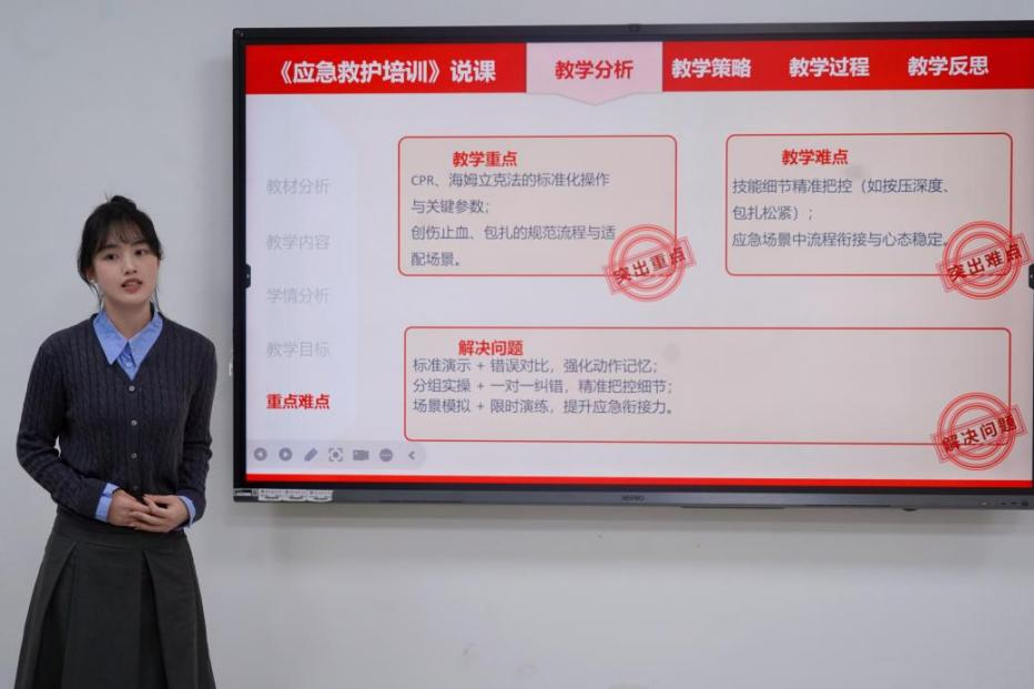 比赛现场,12名参赛选手围绕不同教学主题展开角逐,课程涵盖中小学生、高职及本科生等多个教学对象,既有基础救护知识实操、直播带货全流程实操等实用内容,也有贴合专业的各类教学设计,充分展现了研究生扎实的专业基础与创新教学思维。