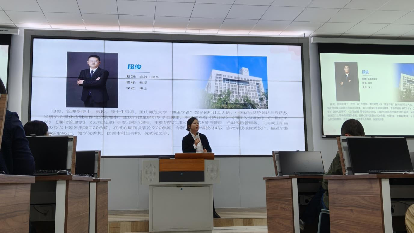 会议伊始,段俊发表讲话。他立足当前金融行业数字化、智能化发展趋势,深入剖析了金融科技、量化投资等新兴领域的机遇与挑战,强调金融工程专业在交叉学科背景下的独特优势。他勉励同学们既要夯实学科基础,也要主动拥抱行业变革,不断提升创新思维与实践能力,着力锻造自身的核心竞争力与可持续发展潜力。随后,周玉琴向同学们系统介绍了财务金融系的师资队伍、教学特色与科研成就。她详细展示了本系雄厚的师资力量、丰硕的教研成果以及良好的育人氛围,让同学们清晰了解到专业的发展实力与成长支撑。周玉琴表示,系部将持续为学子搭建优质的学习交流与实践创新平台,助力同学们在专业领域深耕成长,进一步增强了同学们的专业认同感、归属感与学习自信心。
