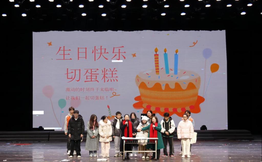 恰逢良辰,心之所向。学院还为近期生日的十位同学准备了生日惊喜,提前联系家长录制生日祝福视频并现场播放,学院党委书记钟敏和执行院长郑景丽与十位同学一起切蛋糕,和现场观众齐唱生日歌,满场的祝福声展现了学院对于学生的亲切关怀,也温暖了晚会现场的每一个人。