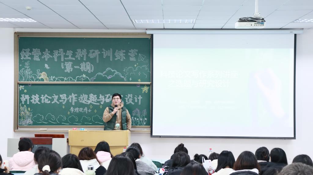 于求是楼213举办经管本科生科研训练营(第一期)——“科技论文写作:选题与研究设计”专题讲座。本次讲座由李增现博士主讲,学院各年级本科生踊跃参加。
