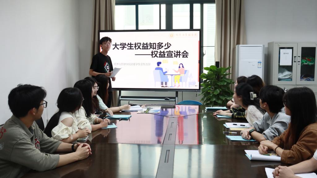 团委学生会于求是楼316开展“大学生权益知多少”权益维护宣讲会。本次宣讲会由团委学生会生活部负责人葛欣恺主讲,第十九届团委学生会全体成员参与。