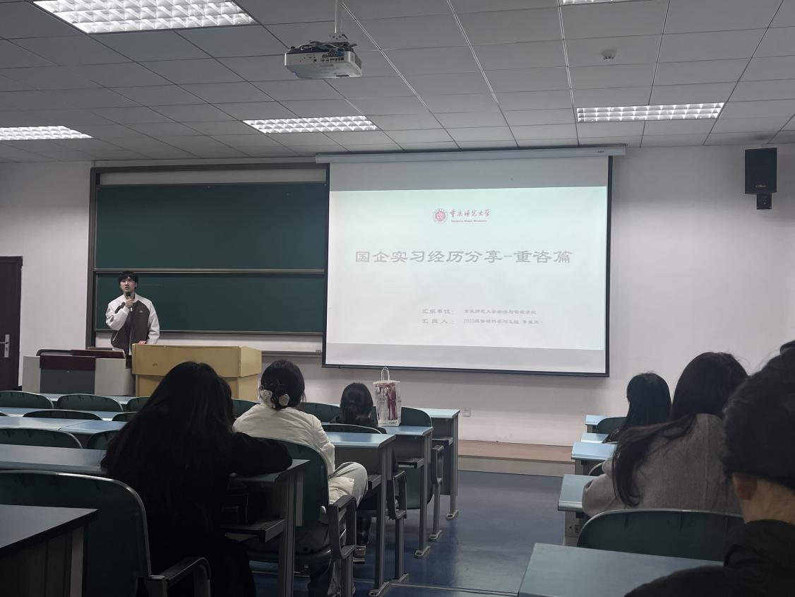 李胤龙同学则结合自己在国企部门的实习经历,展示了现代央企的复合型人才培育模式。他首先提及在实习期间的通勤安排,随后介绍了企业提供的后勤保障体系,包括高标准的工作餐、健身中心以及全面的生活服务设施。然后,他具体讲解了实习时参与研究项目全过程的经历,包括投资机会研究、可行性论证及风险量化评估等核心业务。结合一个月的实习经验,他建议在校生应明确职业方向,通过垂直领域的知识积累和实战能力提升核心竞争力。