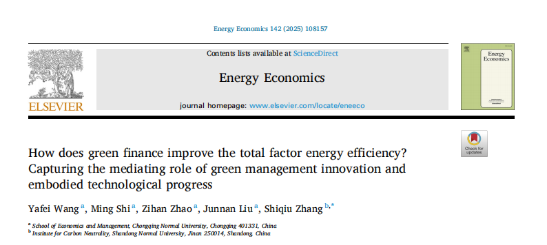 近日,学院王亚飞教授撰写的论文How does green finance improve the total factor energy efficiency?Capturing the mediating role of green management innovation andembodied technological progress在Energy Economics公开发表。