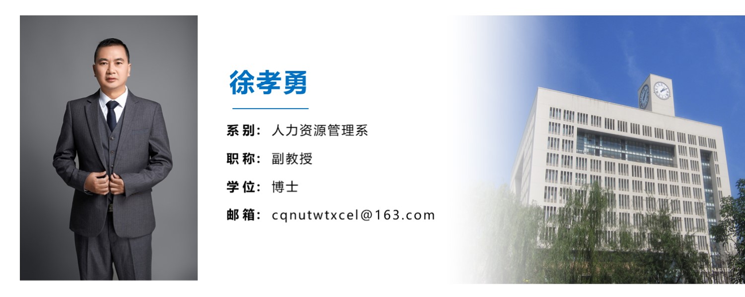 徐孝勇,1979年生,男,汉族,四川西昌人,博士,副教授,硕士生导师,重庆市区域经济学会理事,主要研究方向为农业经济学、区域商贸和农村发展。主持国家社科基金项目和校级项目各1项,主研国家社科基金项目3项,主研省级科研项目2项。在《经济地理》、《改革》、《国际贸易问题》、《农业现代化研究》、《生态经济》、《西南民族大学学报(人文社会科学版)》和《农林经济管理学报》等CSSCI、CSCD核心期刊发表论文16篇,其中2篇论文被人大报刊复印资料全文转载,12篇论文被人大报刊复印资料索引,出版学术专著1部。主讲课程本科生课程《劳动经济学》、《国际贸易理论与实务》、《社会保障学》、《员工关系管理》,研究生课程《农村社会学》、《区域商贸流通研究》。