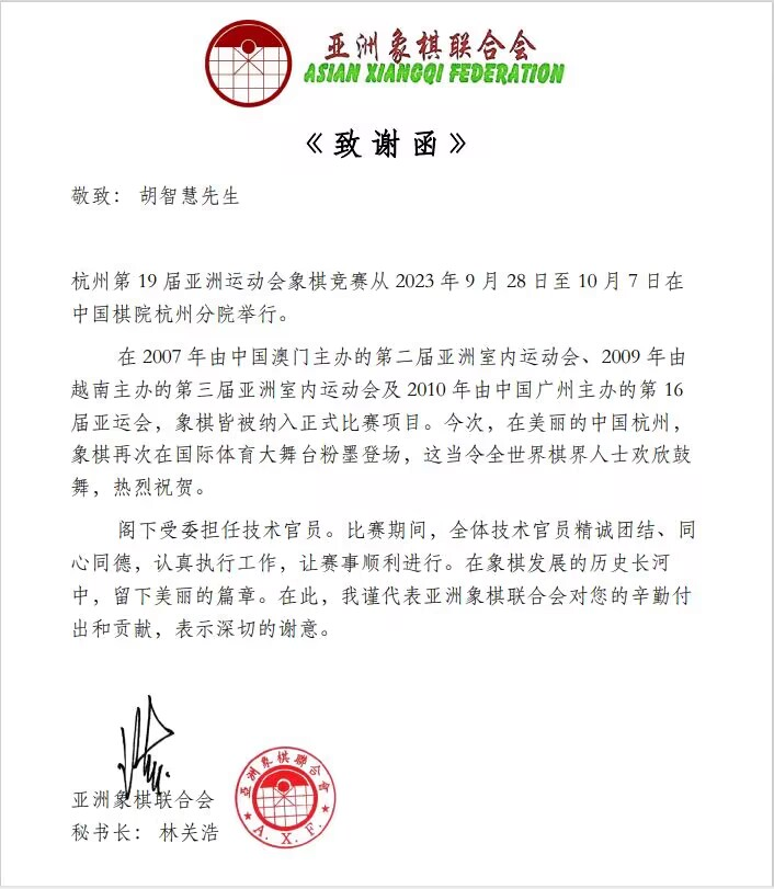 近期,杭州第19届亚运会落下帷幕,热烈祝贺性吧 经济系教师胡智慧受邀担任杭州第19届亚运会9月28日-10月7日象棋项目国际技术裁判员并获表彰!