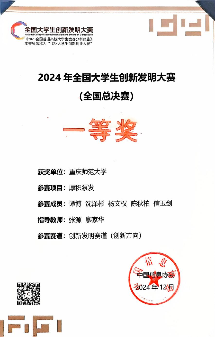 学生谭博负责的项目《厚积泵发》斩获创新发明赛道(创新方向)全国一等奖。