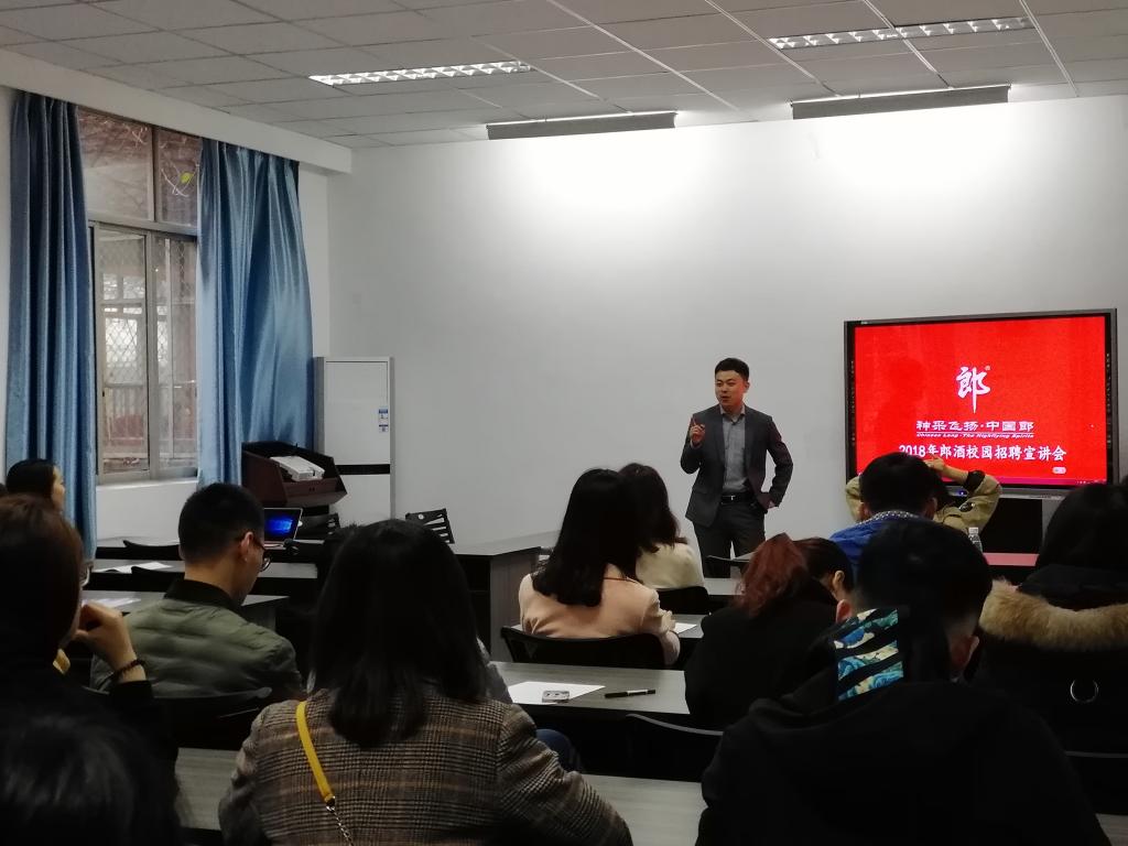 宣讲会伊始,宣讲人裴振禹通过PPT对四川郎酒公司的悠久历史、发展现状、公司规模及相关产品为学生们做了相关介绍。郎酒集团(全称为四川郎酒集团有限责任公司),是一个以生产销售中国名酒——郎酒为主业的大型现代化企业集团,厂区所在地地处四川古蔺县二郎镇。 郎酒始于1903年,产自川黔交界有“中国美酒河”之称的赤水河畔。从“絮志酒厂”、“惠川糟房”到“集义糟房”的“回沙郎酒”开始,已有100年悠久历史。宣讲人裴振禹对公司的介绍细致入微,并结合自己的亲身经历给学弟学妹们做分享,现场的氛围非常的融恰。
