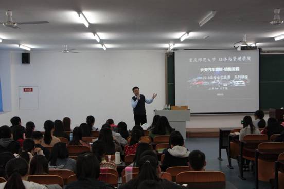 王总首先就营销问题与在座新生进行探讨,营销是以产品、价格、渠道和促销为整体的组合,并以如何划分销售人群为例告诫新生,做销售不可浅尝辄止,盲目宣传,要审时度势,深入研究。王总作为长安集团关系部总监,强调“客服是第一位”。他因注重汽车的售后服务及对客户的态度而获得良好的口碑,并以自身的成功经验劝导新生切忌傲慢自满,要夯实基础,重视自身能力发展。
