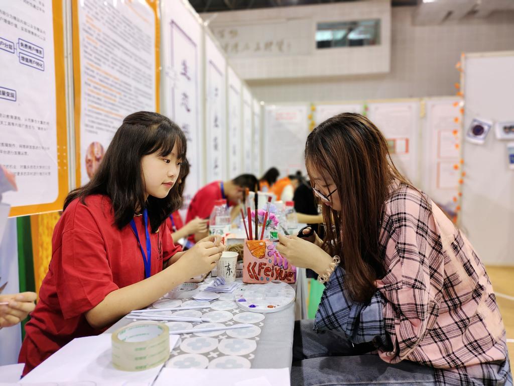 在穗岁丰年展台推出了四个项目。“拯救燃烧的资源”项目吸引不少参观者到展台前一起动手制作精美的手工艺品,将废弃资源重新变得鲜活起来;“双河农家乐”项目旨在充分发挥乡村旅游资源作用,进一步带动农村经济发展,众多参观者在现场品尝了茶叶、核桃等特色农产品;“晓老乡农产品全方面培训台”项目采用现场直播的方式推销各类农产品,在直播中举办的“无表情吃柠檬”带货小游戏更是吸引了不少挑战者前来体验农产品的风味;“学院教师科学研究服务国计民生”项目则充分体现了性吧