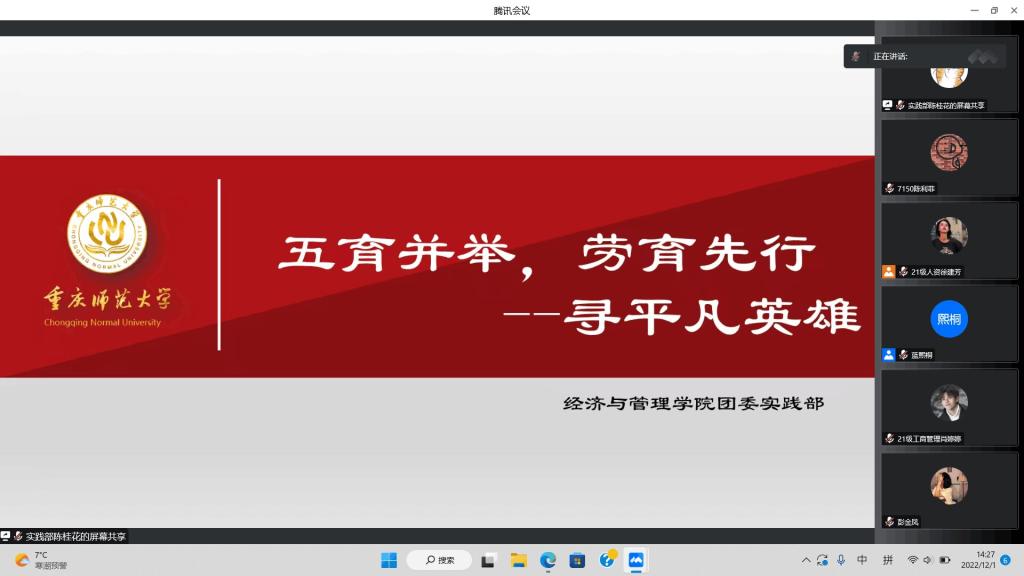 老师为代表的一系列平凡英雄事迹,展现了在疫情突发、面对重重困难时,老师们不畏艰险、逆流而上、无私奉献的精神。她讲到:“我们的平凡英雄老师们不仅有力诠释了学高为师、身正为范,也有力诠释了劳动模范的价值风采。”最后,陈桂花向同学们普及了关于重庆市志愿者证的知识,说明志愿者证的重要性以及注册填写方法,鼓励同学们积极参与志愿者活动。