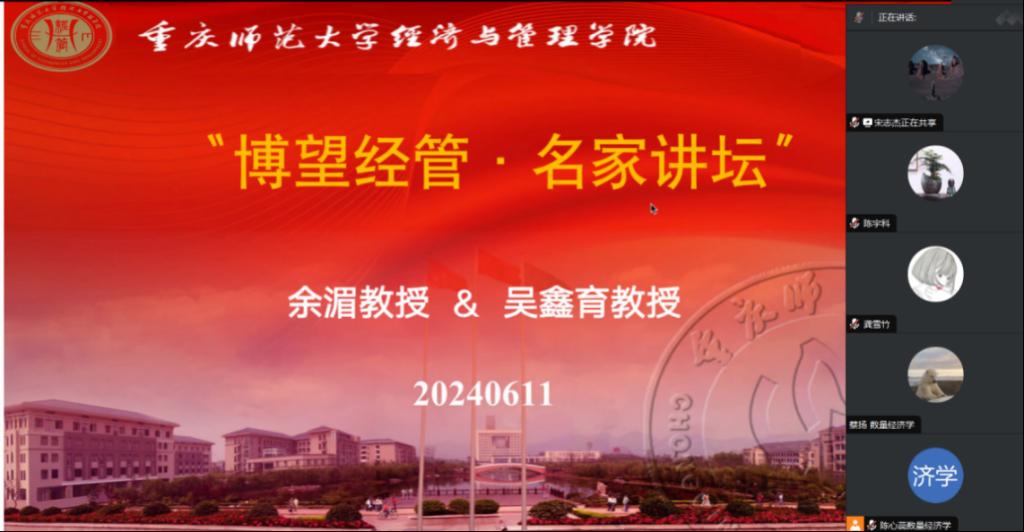 6月11日晚,性吧 邀请了对外经济贸易大学金融学院余湄教授和安徽财经大学金融学院副院长吴鑫育教授在腾讯会议为性吧 师生带来了主题为“风险投资对硬科技企业创新培育机制研究”和“日内信息、成分波动率与期权定价”的学术讲座,本次讲座由学院副院长陈宇科教授主持,学院部分教师及研究生共四十余人参加。讲座伊始,陈宇科副院长代表学院首先对余湄、吴鑫育教授的到来表示热烈的欢迎与感谢,并简要介绍了两位教授的学...